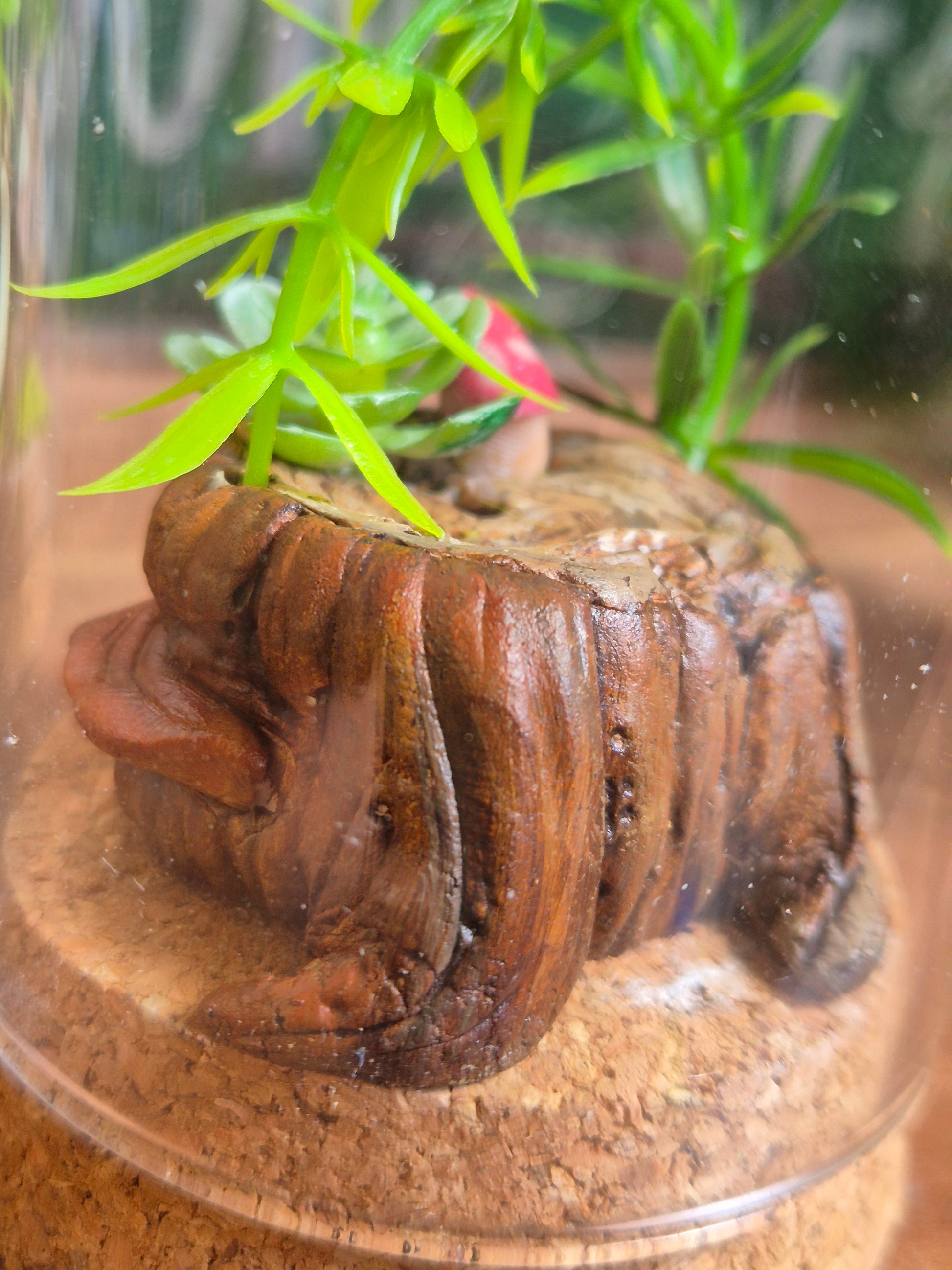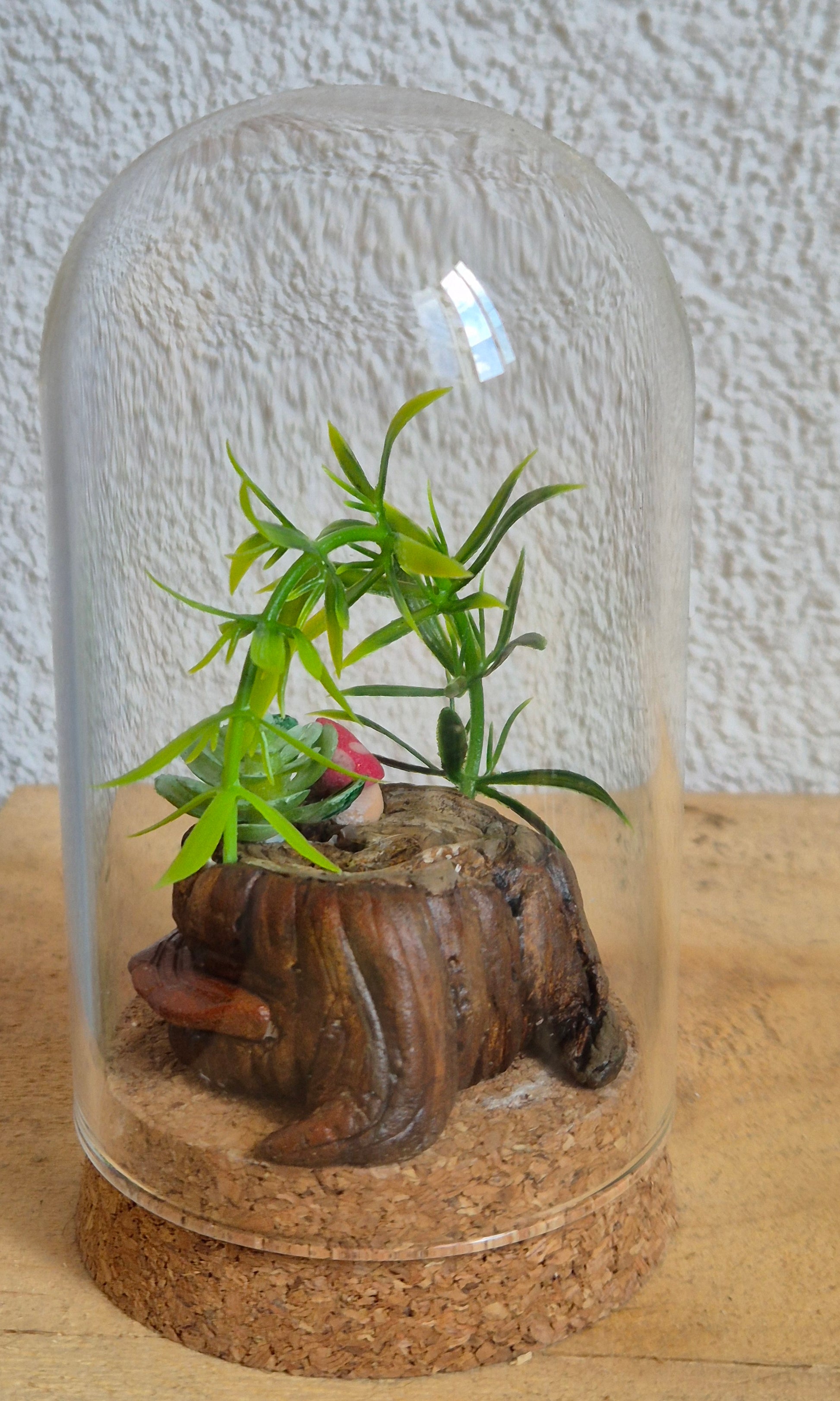 Sous cette cloche de verre se niche une souche d’arbre mystérieuse, vestige d’une forêt enchantée. De sa surface ancienne jaillissent de petits champignons colorés et des plantes aux feuilles délicates, comme si la magie de la terre y battait encore. Chaque détail, de l’écorce texturée à la mousse douce, vous transporte dans un monde miniature où la nature et le merveilleux se mêlent.